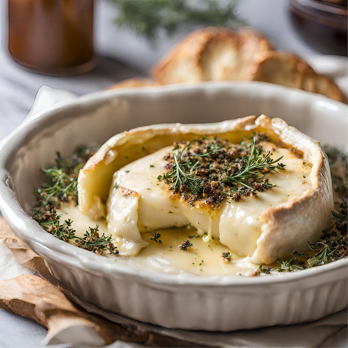 This will have your guests drooling...make a slice in a wheel of Brie, sprinkle Truffle Salt, close the slice, drizzle honey, add a few sprigs of thyme, and bake for 5-10mins. Enjoy!