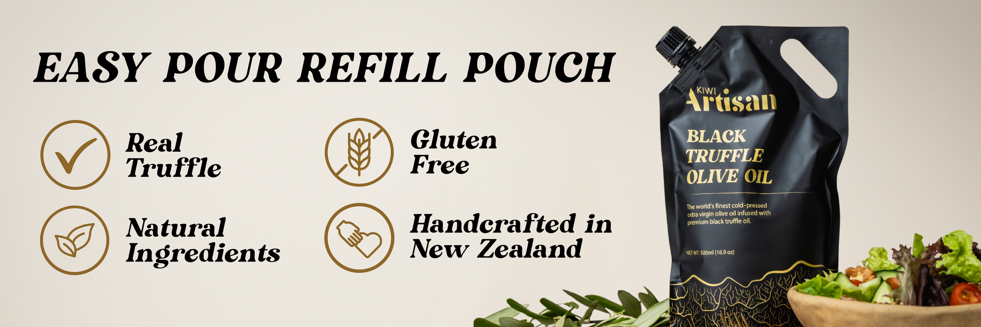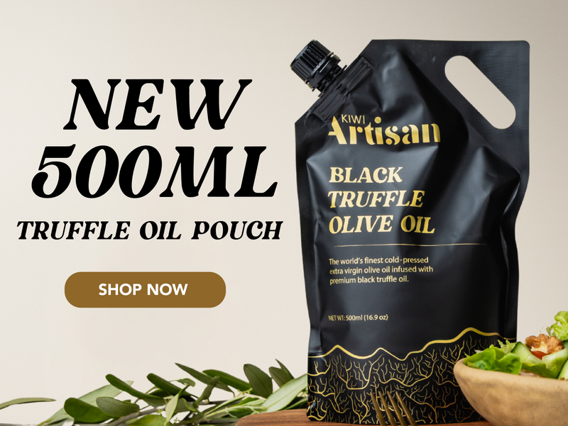 First press oil from olives grown south of Auckland, which infuses with the truffle extract and shavings, to create our New Zealand Black Truffle Olive Oil.